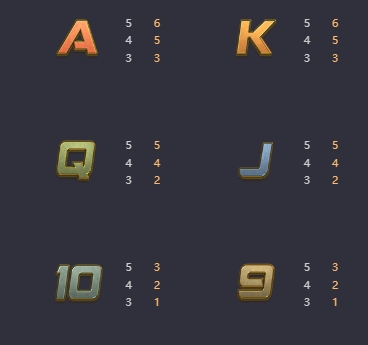 สัญลักษณ์ภายในเกมมีทั้งหมด 10 สัญลักษณ์ โดยมี Scatter และ Wild ที่ให้อัตราการจ่ายเงินแตกต่างกัน ดังนี้