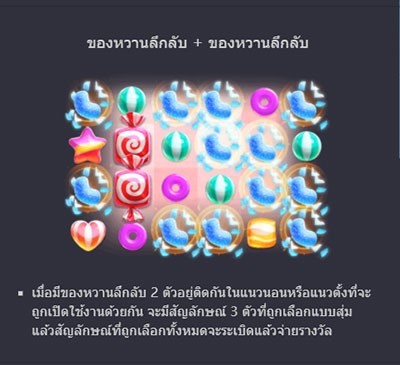 - ลูกอมหมีสีชมพู – เป็นสัญลักษณ์ SCATTER เมื่อหมุนได้ตามจำนวนที่กำหนดจะได้เข้าไปเล่นโบนัสเกม