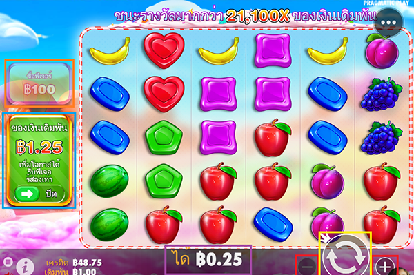 ให้ผู้เล่นกดไปที่ – + เพื่อเป็นการเลือกจำนวนเงินที่จะใช้ในการสปินแต่ละครั้ง โดยจะมีให้เลือกขั้นต่ำที่ 1 บาท